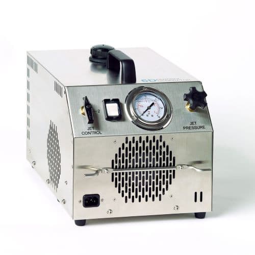 La salida de aerosol se regula con un manómetro calibrado, garantizando 20 - 23 psi de presión en la tobera de inyección, según los estándares de la industria. El generador 6D cumple con todos los requisitos eléctricos y de seguridad aplicables y está aprobado por CE.